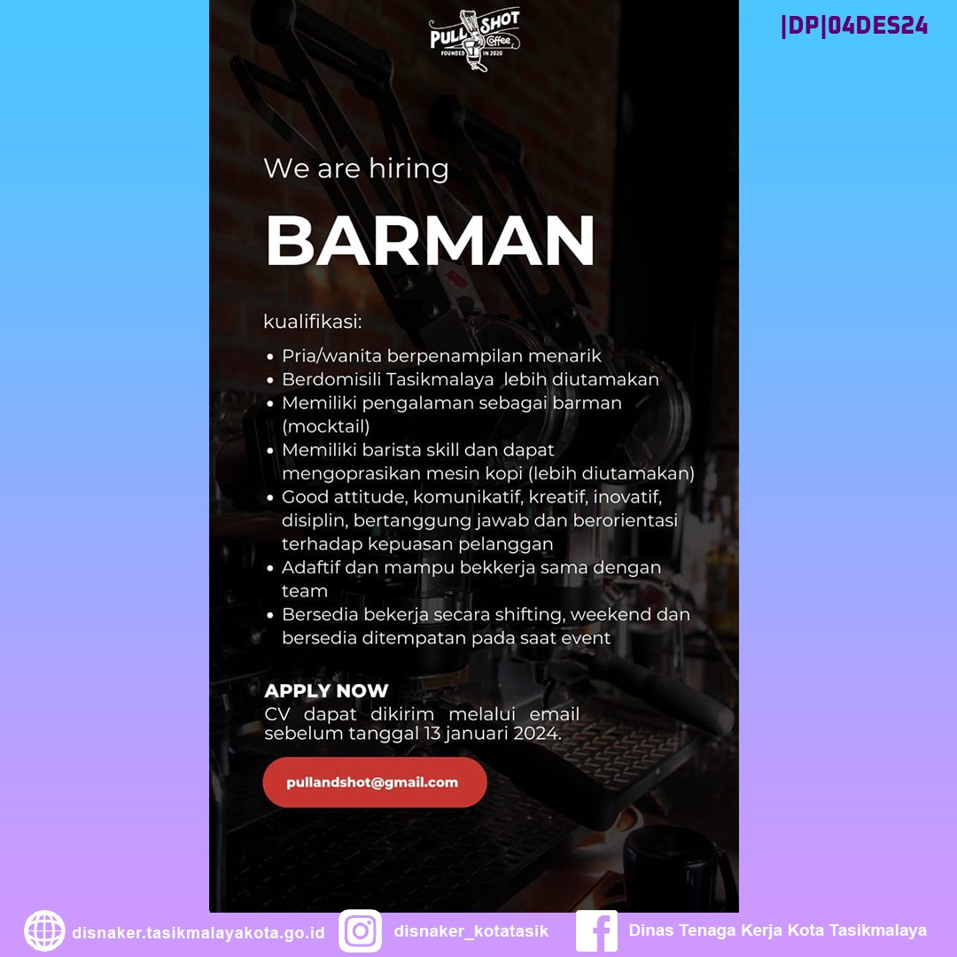 Perusahaan:PULL AND SHOT COFFEE    Lokasi:TASIKMALAYA Dibuat:04-January-2024    Masa Berlaku:13-January-2024    Dilihat:690