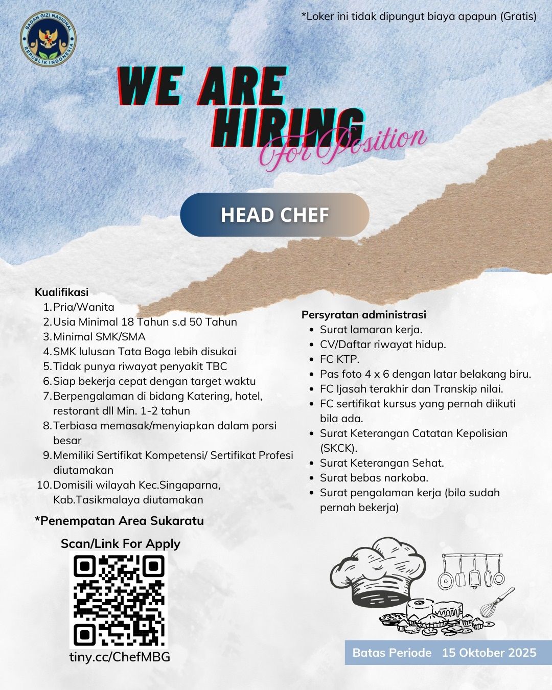 - Head Chef (min. SMA/SMK Tata Boga, pengalaman katering/resto 1–2 tahun)