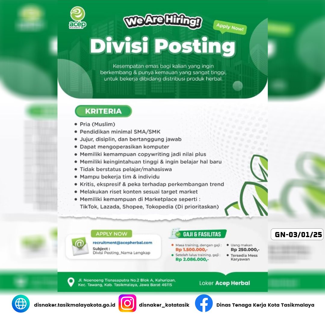 Yuk, jadi bagian dari Divisi Posting kami! Buat kamu yang passionate di dunia digital dan siap jadi garda terdepan distribusi produk herbal, ini waktunya buat level up karier!
