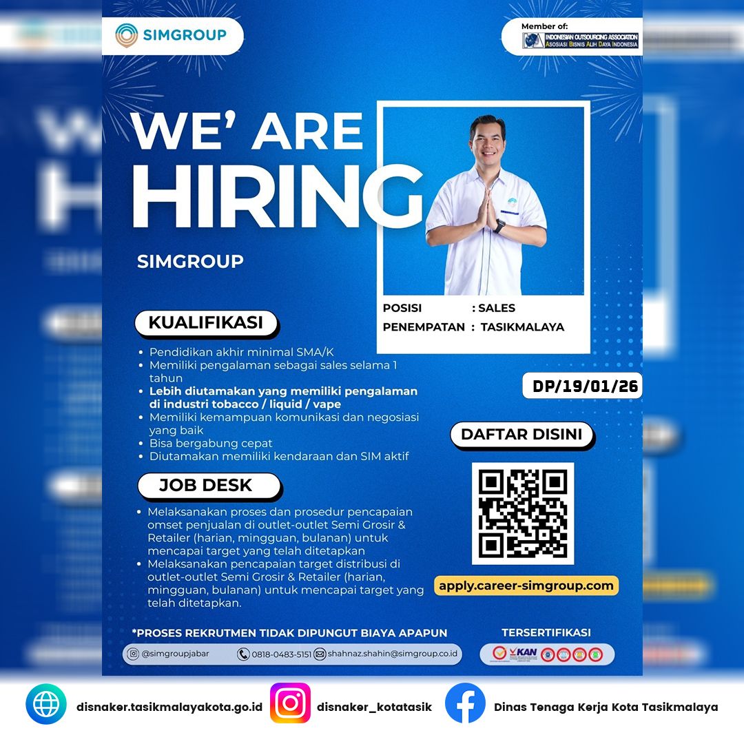 SIMGROUP sedang membuka kesempatan karir bagi Anda untuk bergabung sebagai Sales di wilayah penempatan Tasikmalaya.