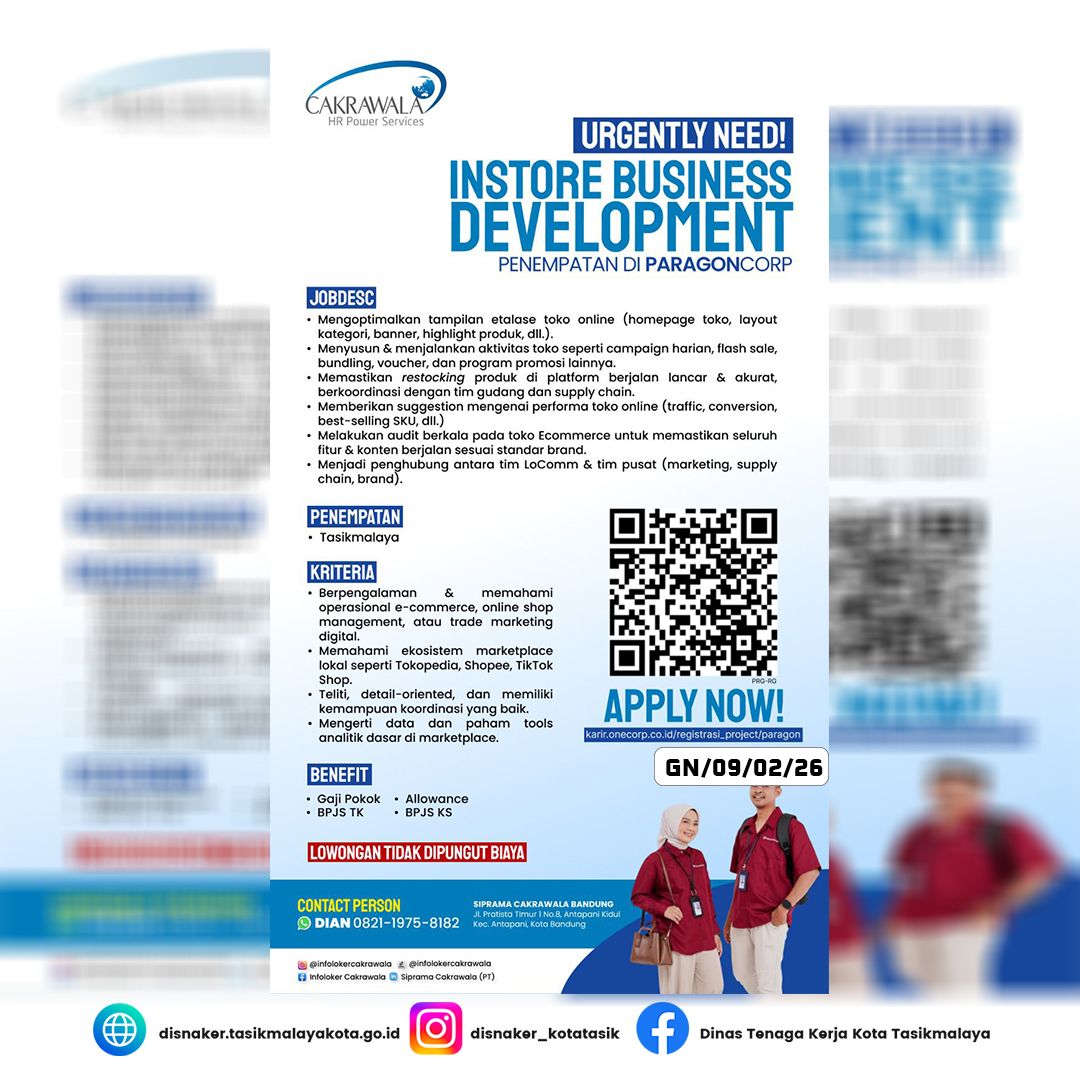 Siprama Cakrawala bekerja sama dengan ParagonCorp sedang membuka kesempatan karier bagi profesional muda yang berdedikasi untuk mengisi posisi Instore Business Development untuk penempatan di wilayah Tasikmalaya.
