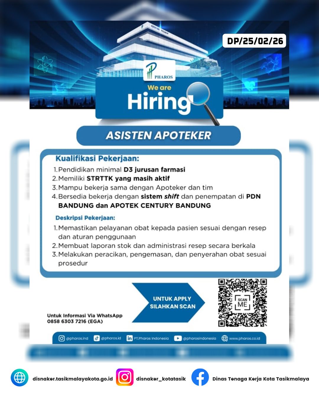 Halo Rekan Farmasi! PT Pharos Indonesia sedang membuka kesempatan bagi kamu untuk bergabung sebagai Asisten Apoteker untuk penempatan di PDN Bandung dan Apotek Century Bandung.