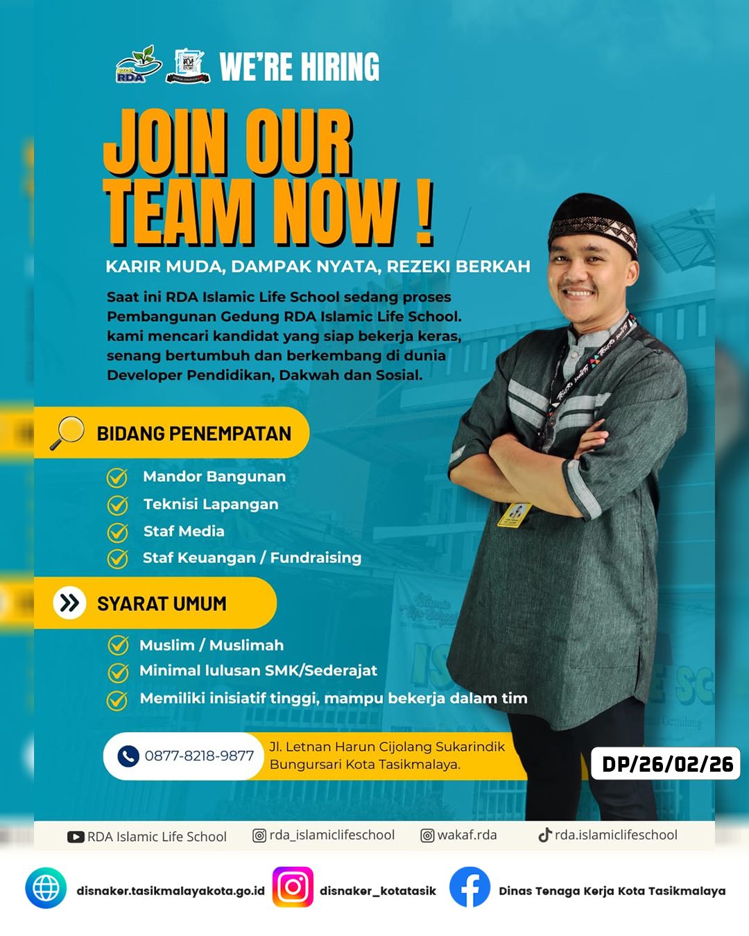 Panggilan untuk kamu yang ingin berkarir sekaligus menanam amal jariyah! Saat ini RDA Islamic Life School sedang dalam tahap pembangunan gedung baru dan kami mencari pejuang yang siap bertumbuh bersama di dunia Pendidikan, Dakwah, dan Sosial.