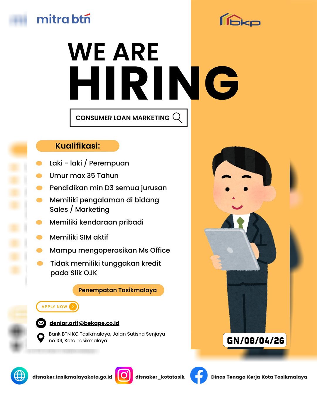 Halo warga Tasikmalaya! Mitra BTN (BKP) sedang mencari talenta berbakat untuk bergabung sebagai Consumer Loan Marketing penempatan Tasikmalaya.