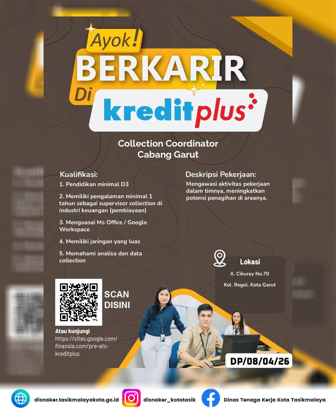 Kreditplus sedang mencari kandidat profesional untuk mengisi posisi Collection Coordinator penempatan Cabang Garut. Jika Anda memiliki jiwa kepemimpinan dan pengalaman di bidang finance, ini adalah kesempatan Anda!