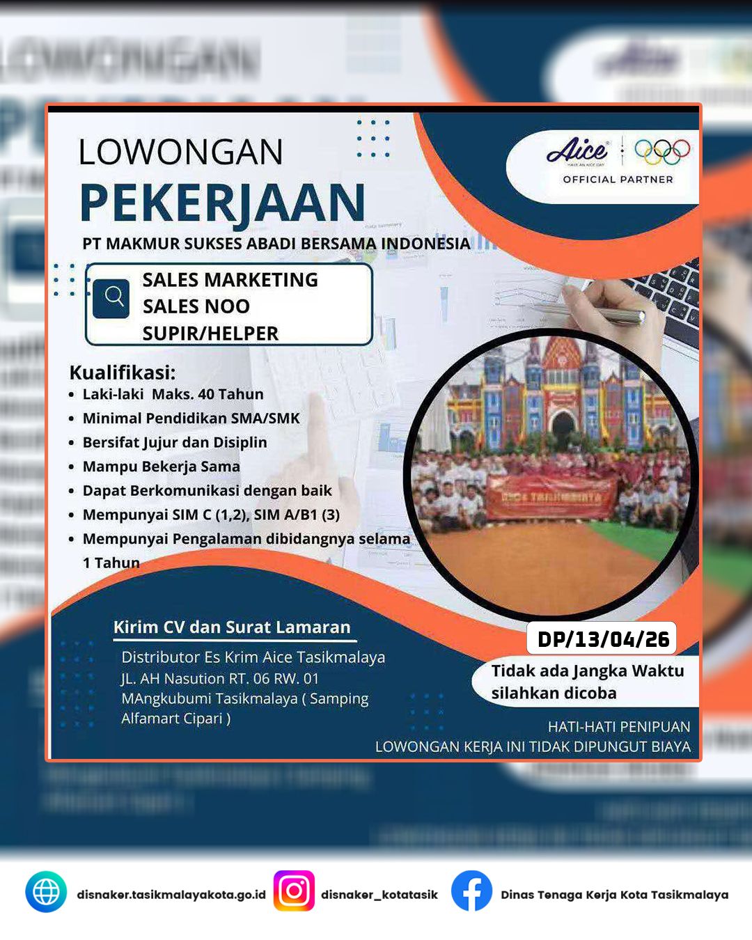 Perusahaan:PT Makmur Sukses Abadi Bersama Indonesia AICE    Lokasi:KOTA TASIKMALAYA Dibuat:13-April-2026    Masa Berlaku:30-April-2026    Dilihat:139