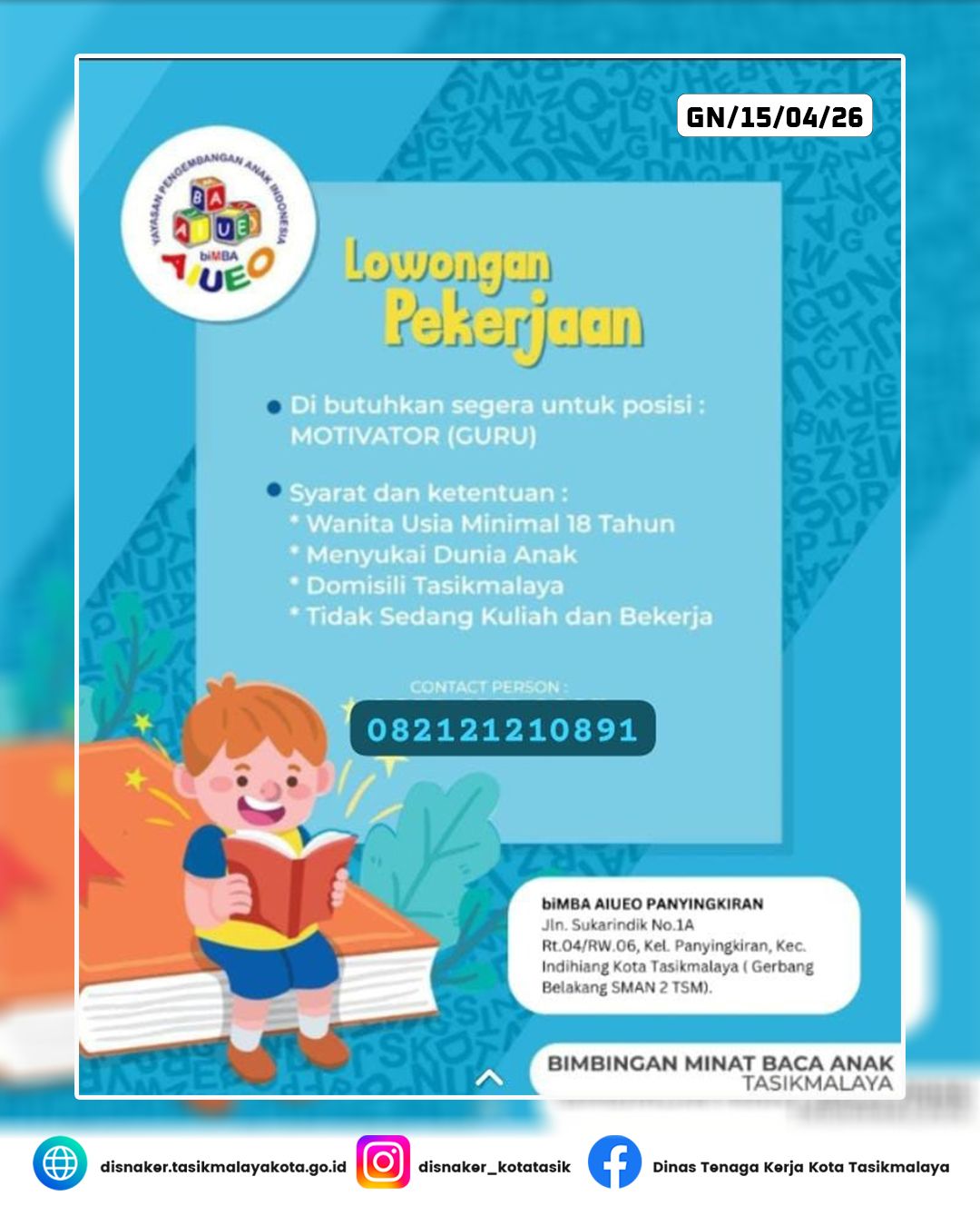 Lokasi Penempatan: biMBA AIUEO PANYINGKIRAN Jln. Sukarindik No. 1A, Kec. Indihiang, Kota Tasikmalaya (Gerbang Belakang SMAN 2 TSM).