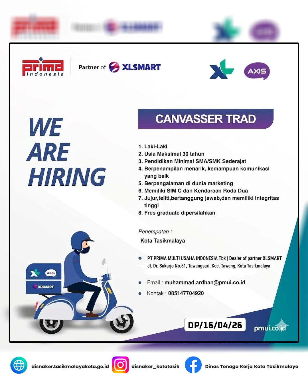 Kualifikasi Umum:?Pendidikan minimal SMA/SMK Sederajat.?Memiliki SIM C & kendaraan roda dua.?Mampu berkomunikasi dengan baik & berorientasi pada target.Penempatan: Kota Tasikmalaya.Cara Melamar:Kirimkan CV terbaru kalian ke email:???? muhammad.ardhan@pmui.co.idAtau hubungi kontak person:0851-4770-4920Yuk, jadi bagian dari keluarga besar PT Prima Multi Usaha Indonesia!