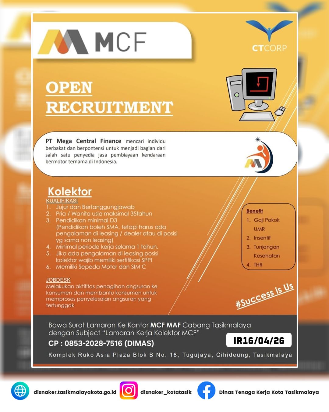 Cara Melamar:Bawa Surat Lamaran langsung ke Kantor MCF MAF Cabang Tasikmalaya:Komplek Ruko Asia Plaza Blok B No. 18, Tugujaya, Cihideung, Tasikmalaya.Atau hubungi kontak person yang tertera di flyer:Kolektor: 0853-2028-7516 (Dimas)CMO: 0822-1589-255 (WhatsApp)